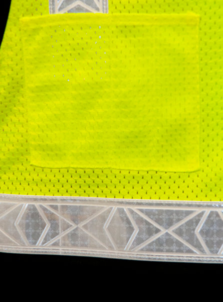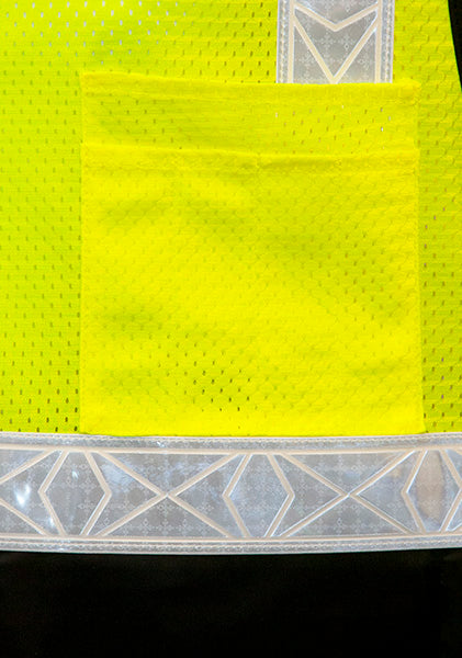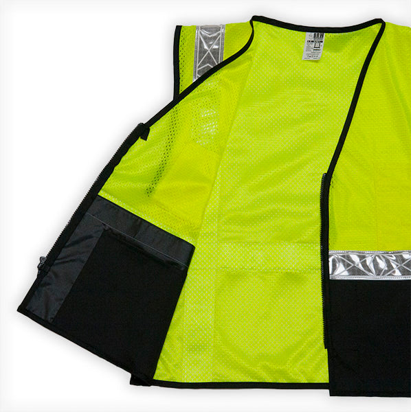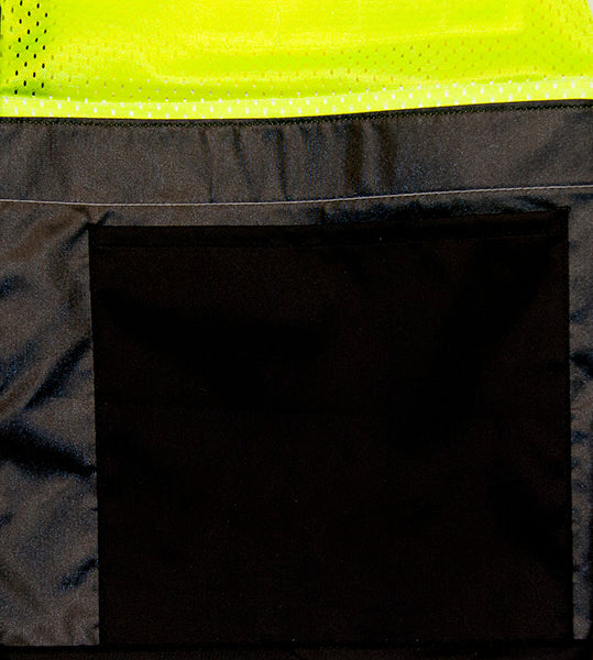 Description: Fluorescent yellow high visibility safety vests with durable black nylon material on lower front. The black material adds durability and keeps the vest clean looking by hiding dirt.